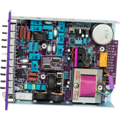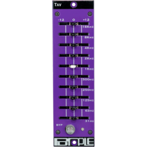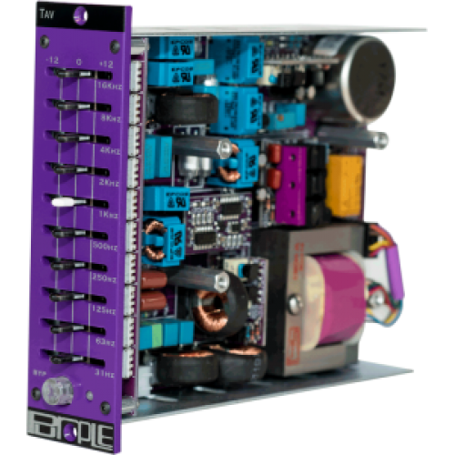 The Purple Audio TAV is a ten-band inductor-based graphic equalizer designed to fit standard 500 Series racks. It features high-quality inductors and carefully selected capacitors to set the center frequency for each band. Each band can boost or cut by 12 dB, with bands narrow enough at full boost or cut for precise control, yet broader at lower settings for smoother tonal shaping. It includes an illuminated pushbutton for relay true bypass, allowing easy comparison with the unprocessed source signal. The unit has a tricolor LED level meter for signal monitoring.