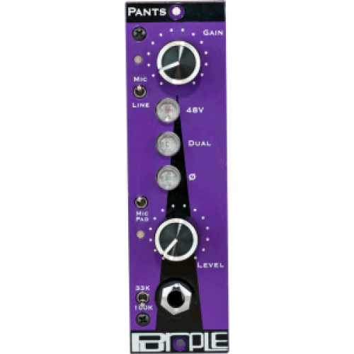 The Purple Audio Pants is a four op-amp differential microphone preamp designed for standard 500 Series racks. It features a unique dual-bobbin input transformer from Cinemag that offers distinct tonal qualities. The unit allows precise control over sound with a smooth Gain control and a separate Level control for output adjustment. It has a "High" switch that changes the feedback network to provide up to 78dB of clean gain, suitable for very low output microphones. The preamp can generate a variety of tones at the same output level using different Gain, High mode, and Level settings.