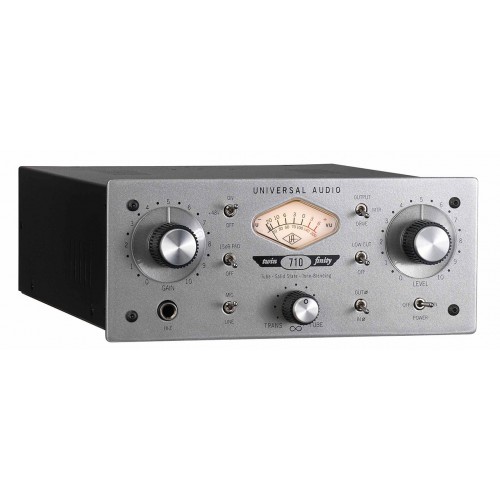 The Universal Audio 710 Twin-Finity is a single-channel microphone preamplifier that blends both tube and solid-state amplification for versatile tone shaping. It includes a direct input (DI) for instruments like guitars and basses and offers phase-aligned tube and solid-state circuitry for customizable sound. You can blend between tube warmth and solid-state clarity to achieve a wide variety of tones.